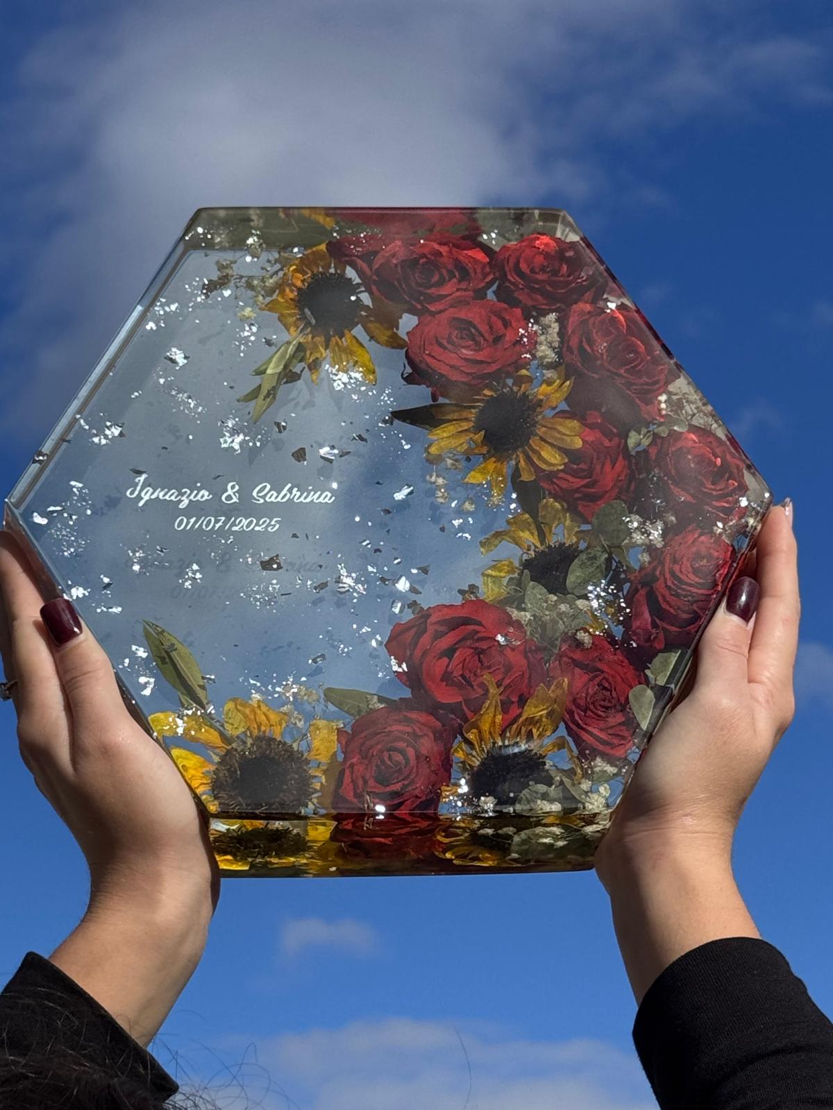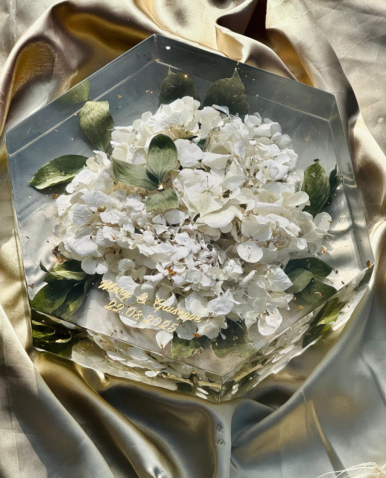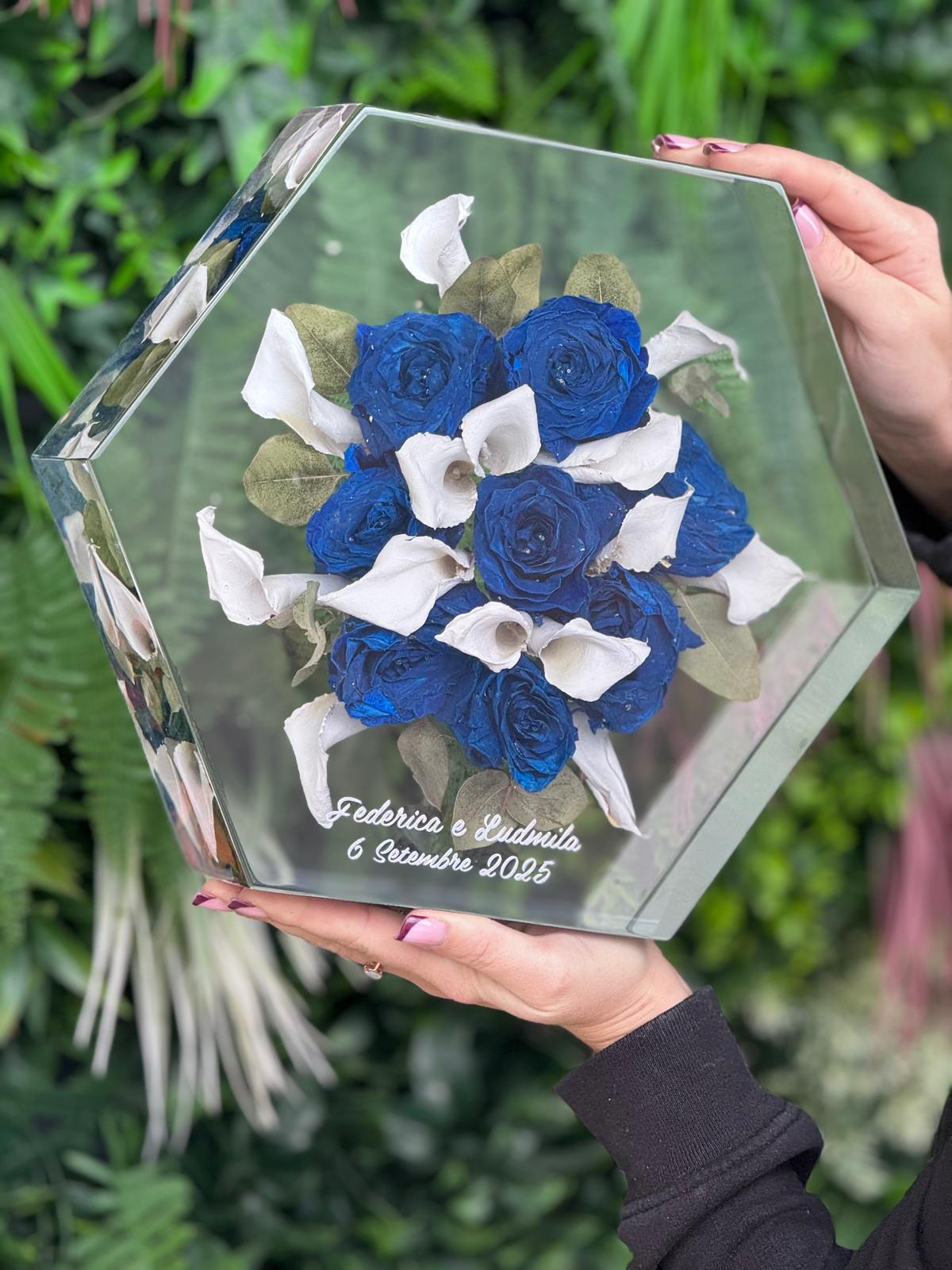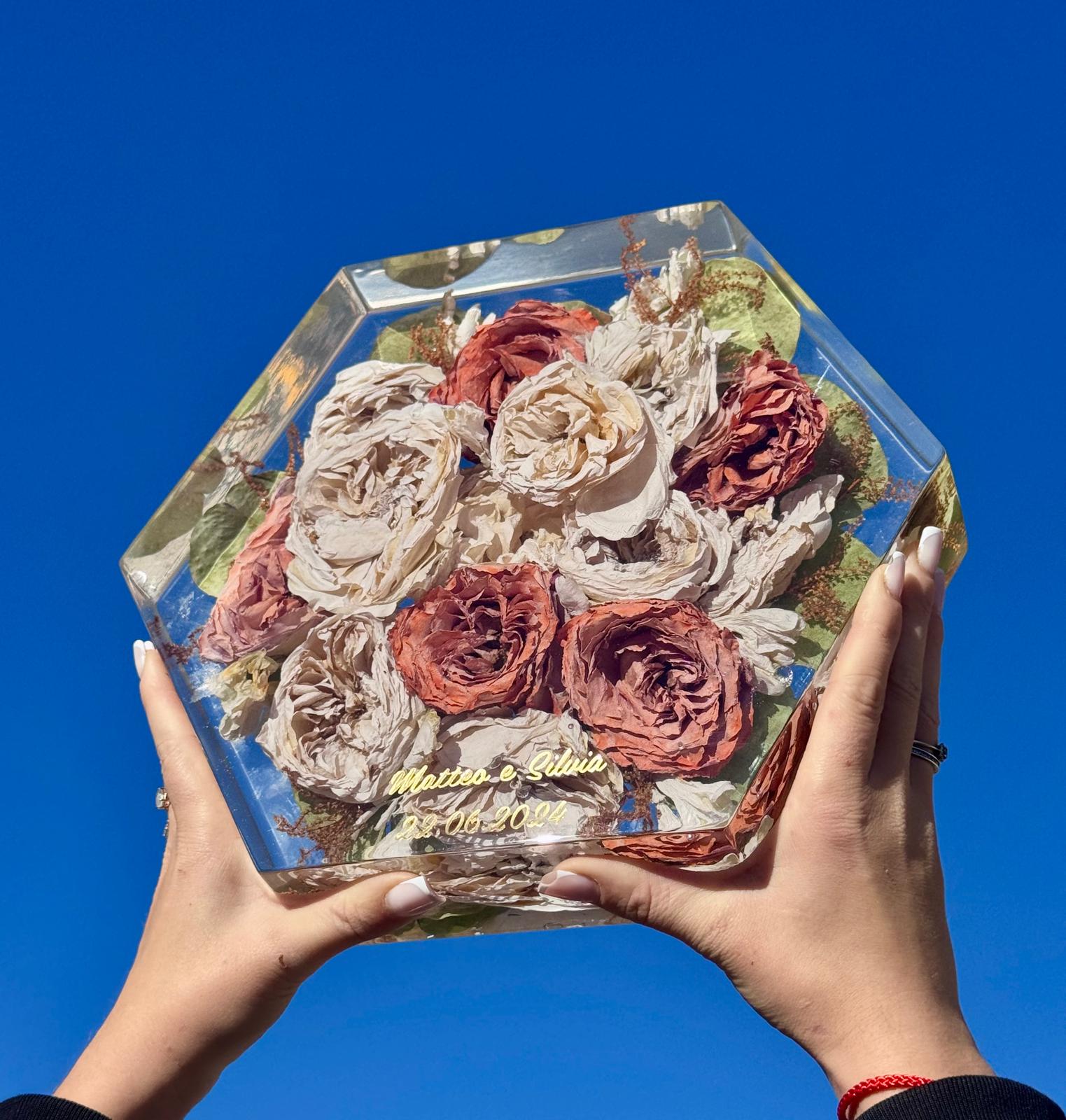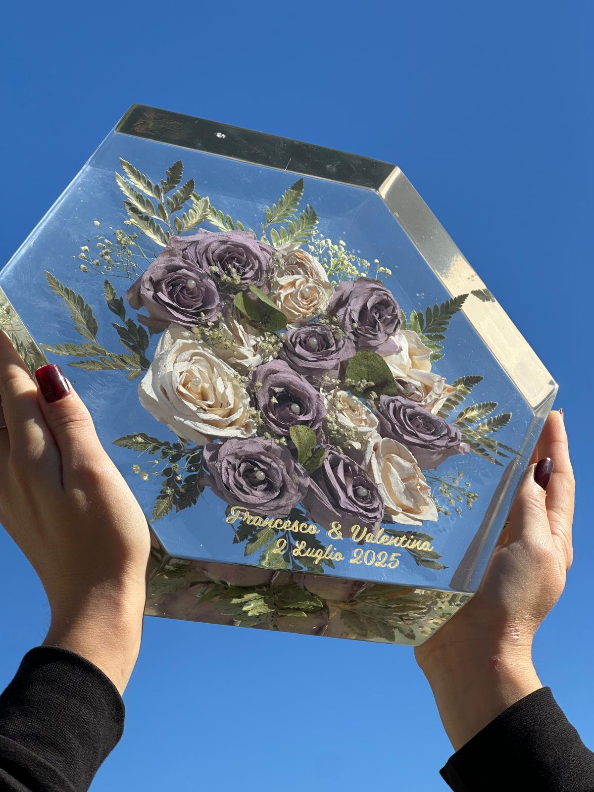Acquistando questo articolo avrai la possibilità di preservare per sempre i fiori del tuo giorno più bello. Ci tengo a precisare che utilizzo una resina di alta qualità CICLOALIFATICA per evitare ingiallimento negli anni. Il prezzo è compreso di RITIRO dei fiori più SPEDIZIONE.E’ importante in caso di fiori freschi ricevere il bouquet il prima possibile dopo il matrimonio per un lavoro ottimale. Ti spiegherò io come imballare bene il pacco. Prenoterò poi il ritiro tramite il mio corriere che passerà direttamente a casa tua. Ricevuto il bouquet, avvio un processo di disidratazione, questa fase richiede tre settimane, dopo di che passo all’inglobazione dei fiori, un lavoro lungo e delicato. I miei sono formati EXTRA LARGE a scelta quadrato o esagonale, entrambe con una misura di 30cm. Il costo compreso di LUCIDATURA. Il lavoro dura circa 3 MESI!