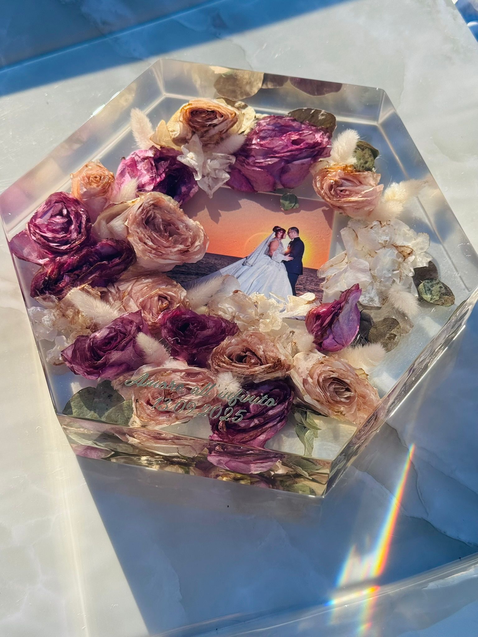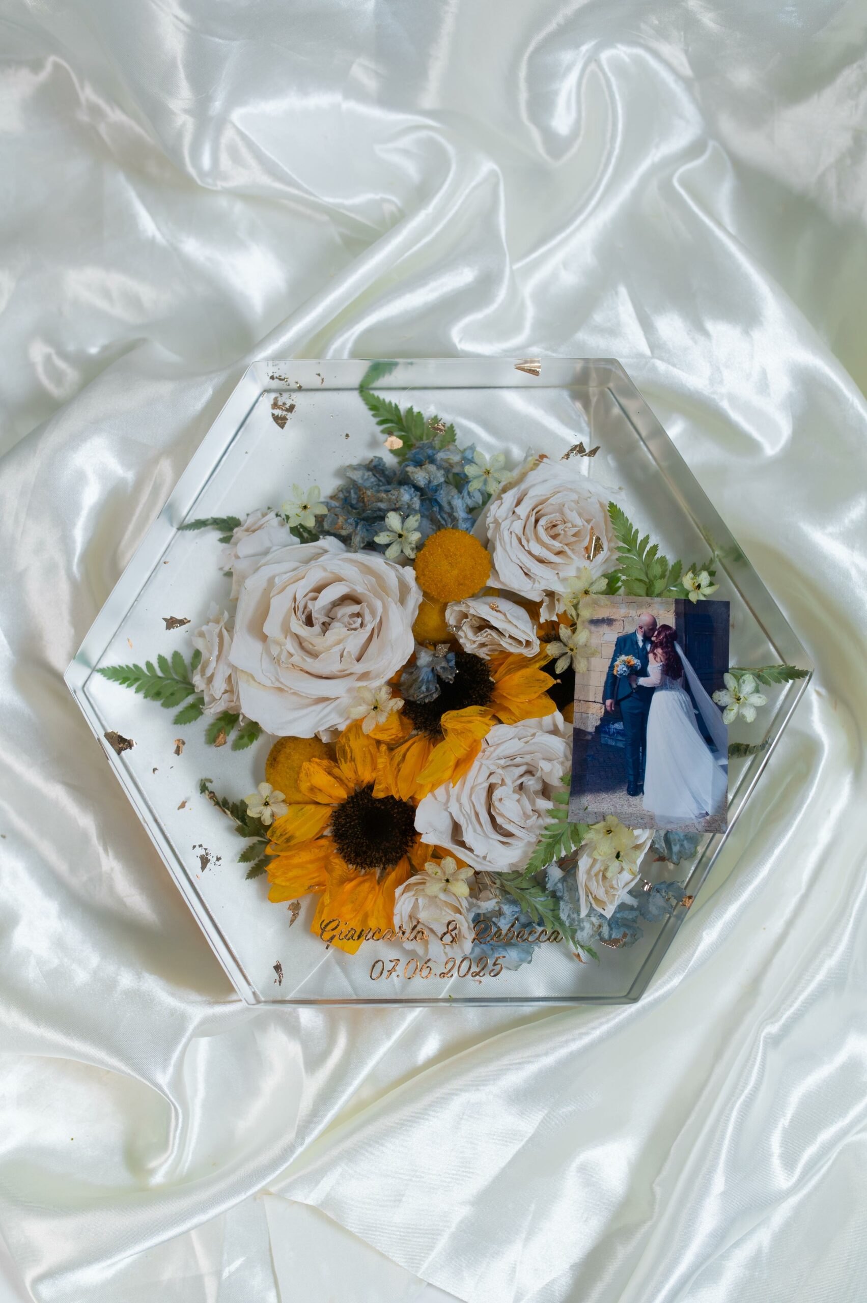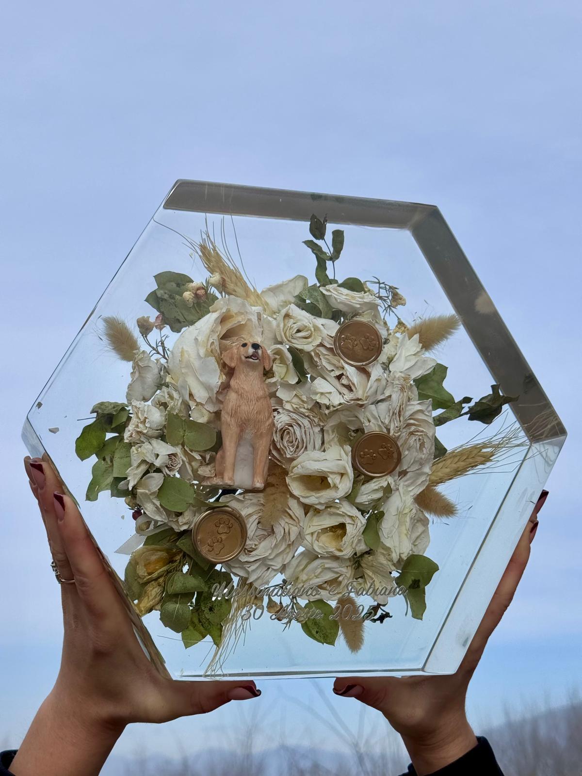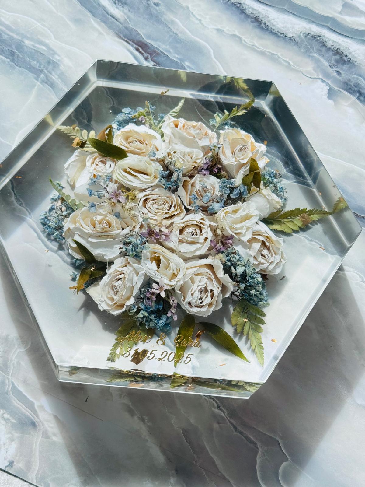Acquistando questo articolo avrai la possibilità di preservare per sempre i fiori del tuo giorno più bello. Ci tengo a precisare che utilizzo una resina di alta qualità CICLOALIFATICA per evitare ingiallimento negli anni. Il prezzo è compreso di RITIRO dei fiori più SPEDIZIONE.E’ importante in caso di fiori freschi ricevere il bouquet il prima possibile dopo il matrimonio per un lavoro ottimale. Ti spiegherò io come imballare bene il pacco. Prenoterò poi il ritiro tramite il mio corriere che passerà direttamente a casa tua. Ricevuto il bouquet, avvio un processo di disidratazione, questa fase richiede tre settimane, dopo di che passo all’inglobazione dei fiori, un lavoro lungo e delicato. I miei sono formati EXTRA LARGE a scelta quadrato o esagonale, entrambe con una misura di 30cm. Il costo compreso di LUCIDATURA. Il lavoro dura circa 3 MESI!