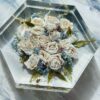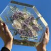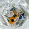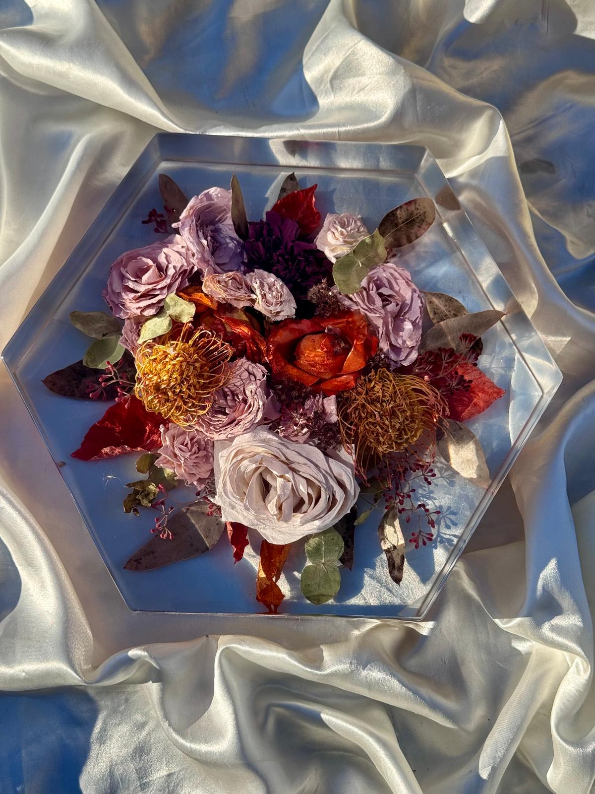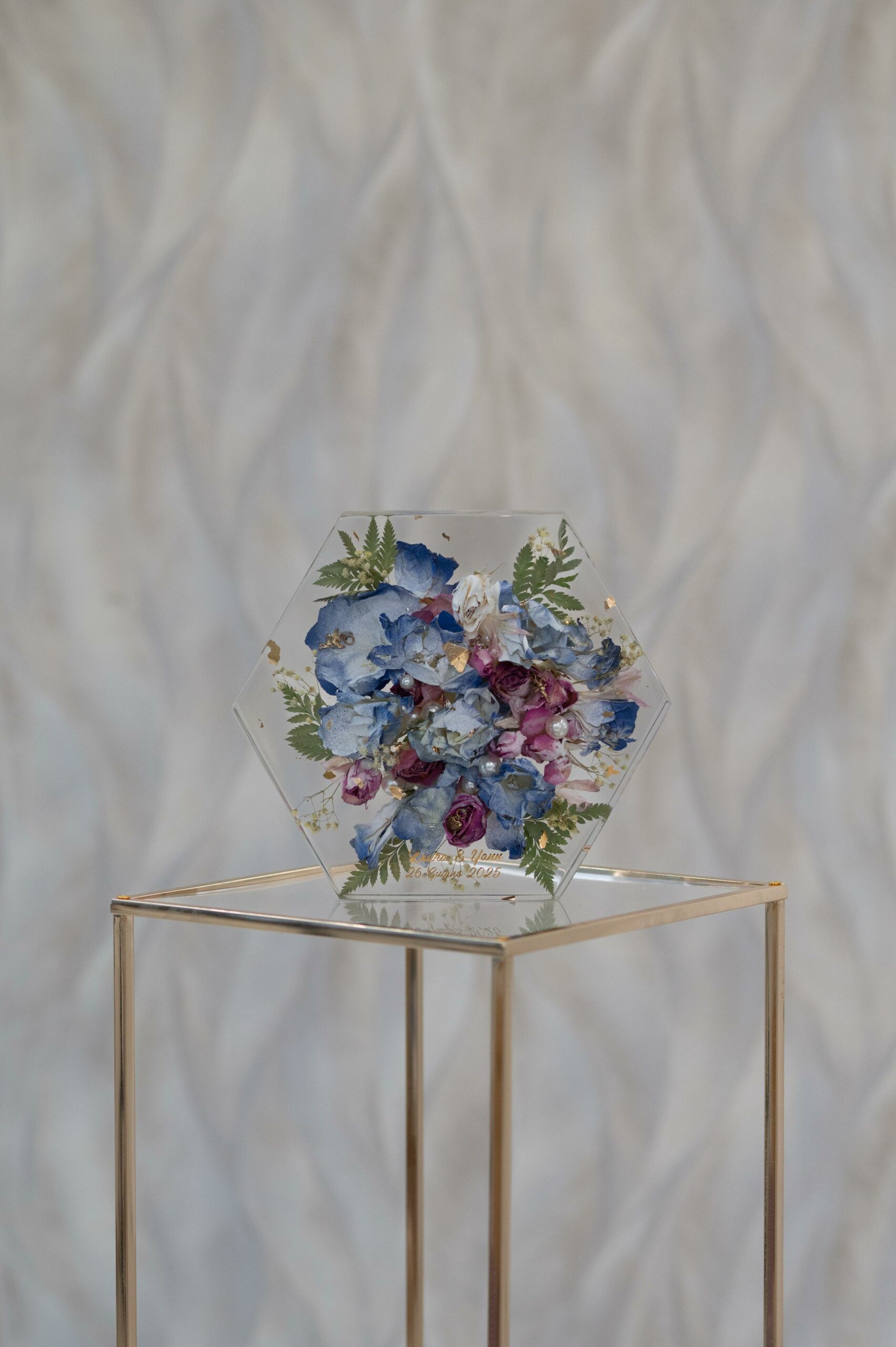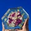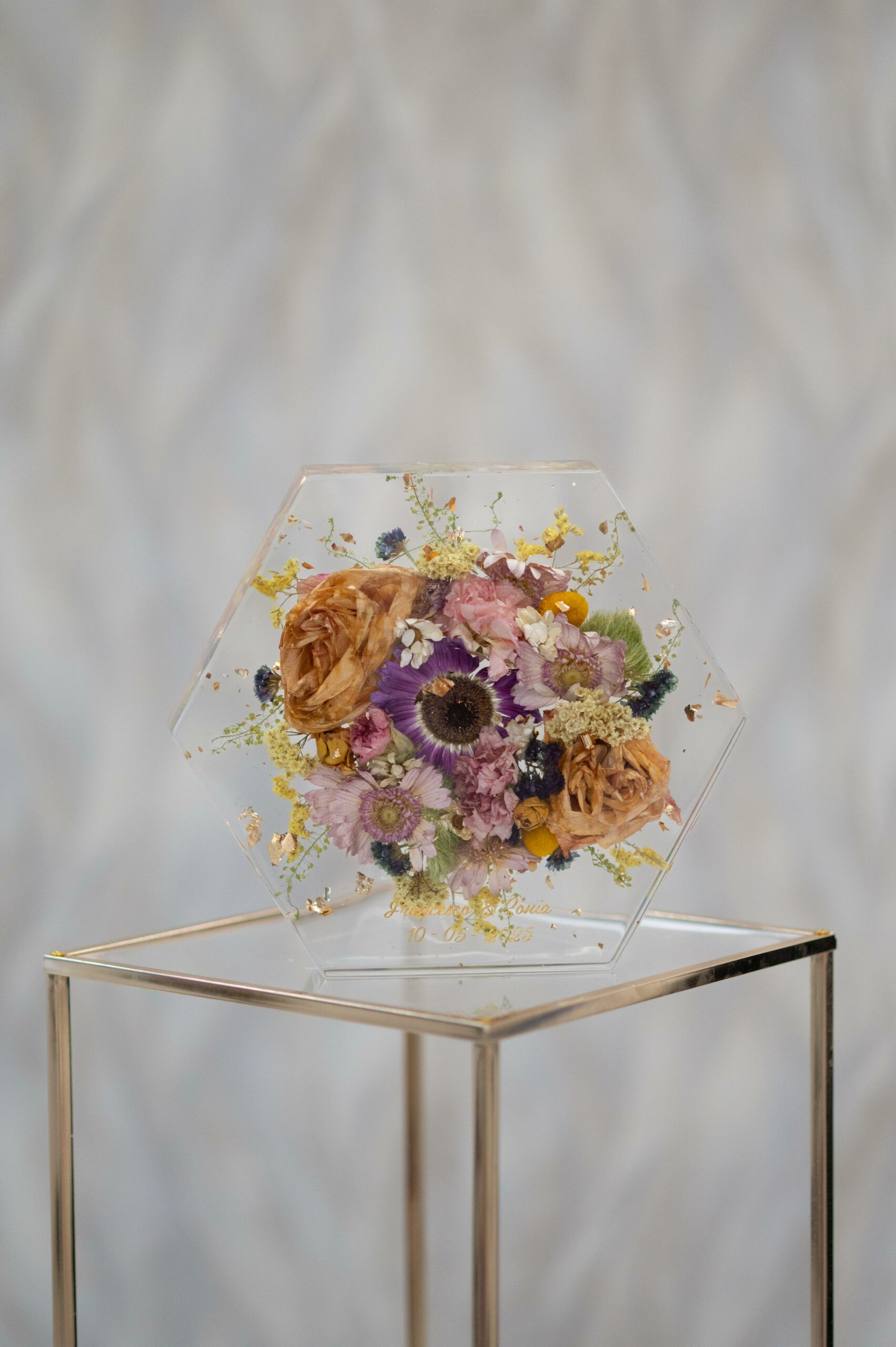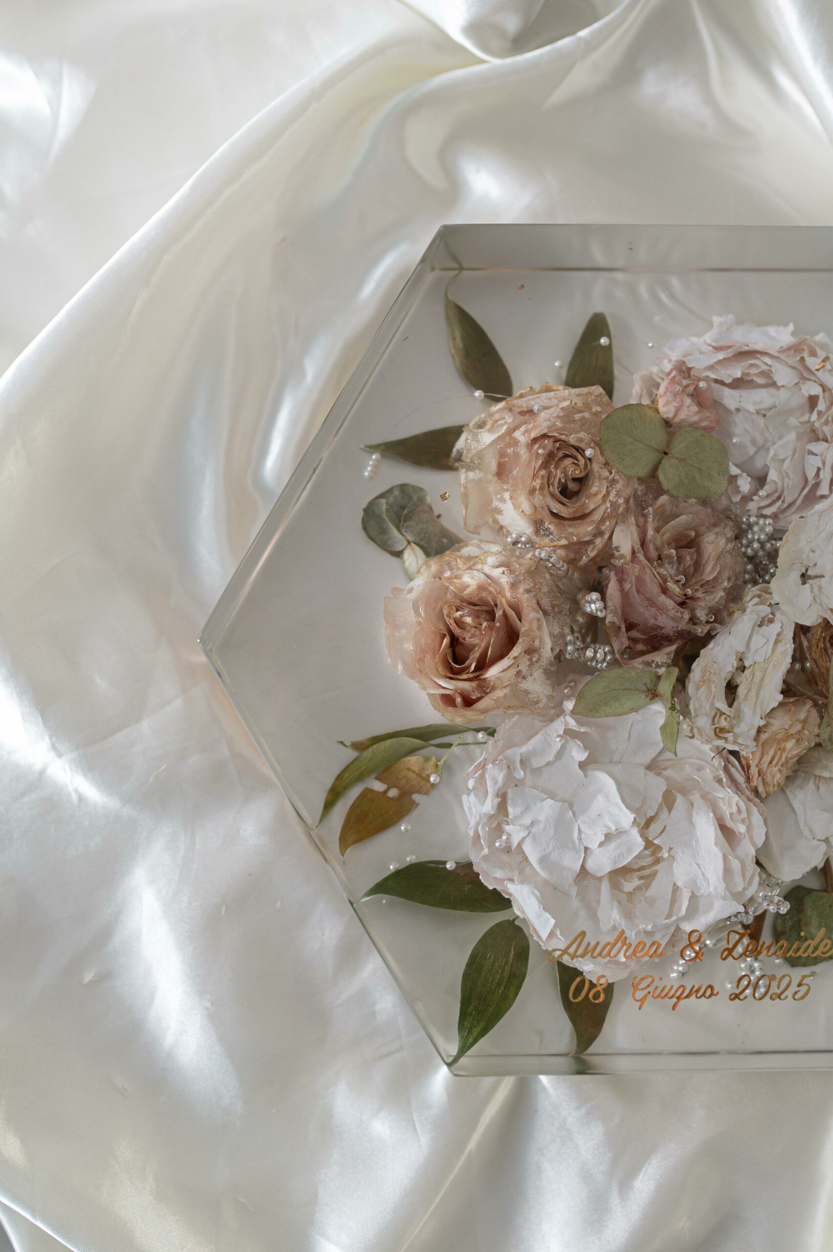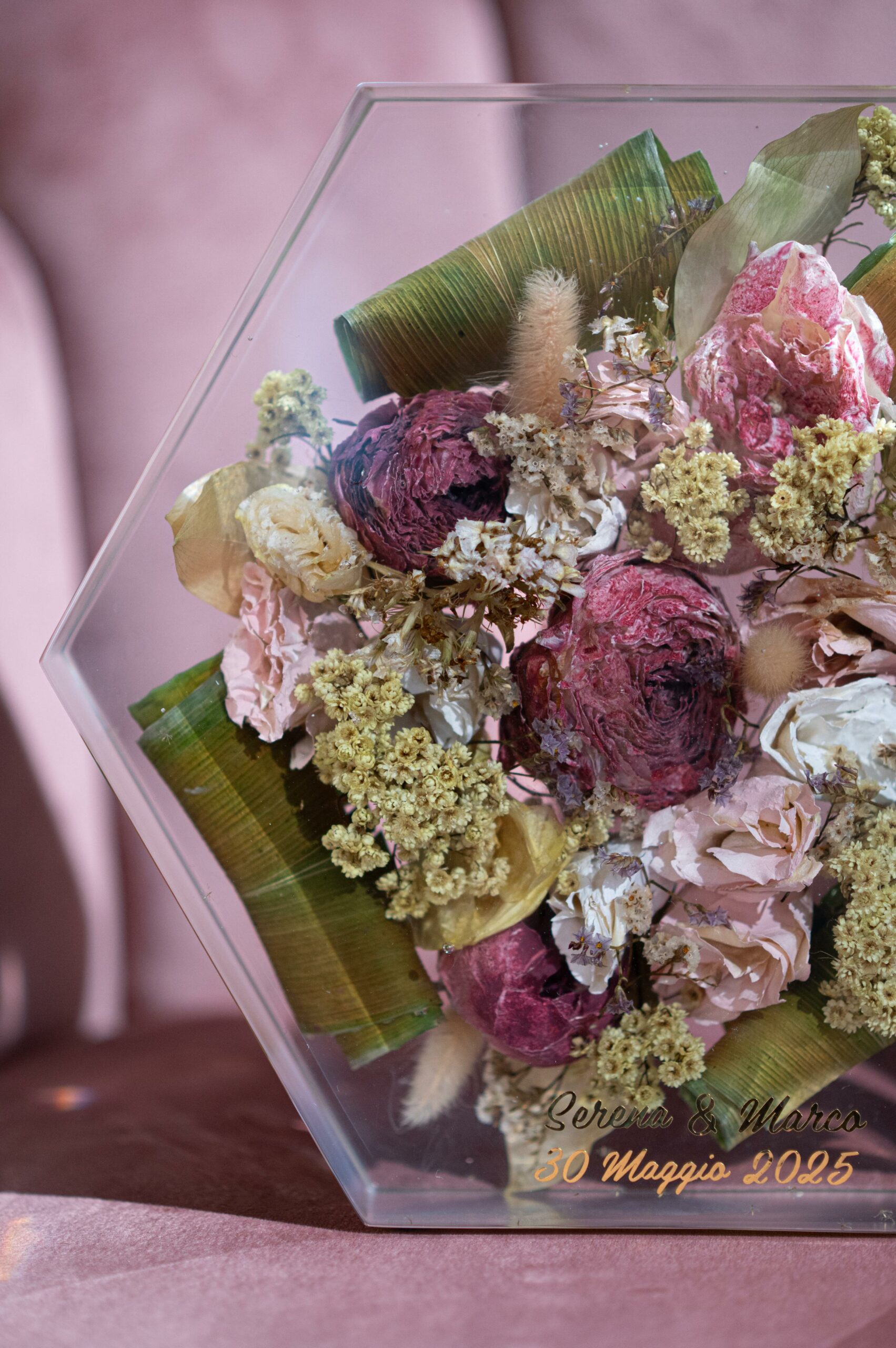 Acquistando questo articolo avrai la possibilità di preservare per sempre i fiori del tuo giorno più bello. Ci tengo a precisare che utilizzo una resina di alta qualità CICLOALIFATICA per evitare ingiallimento negli anni. Il prezzo è compreso di RITIRO dei fiori più SPEDIZIONE.E’ importante in caso di fiori freschi ricevere il bouquet il prima possibile dopo il matrimonio per un lavoro ottimale. Ti spiegherò io come imballare bene il pacco. Prenoterò poi il ritiro tramite il mio corriere che passerà direttamente a casa tua. Ricevuto il bouquet, avvio un processo di disidratazione, questa fase richiede tre settimane, dopo di che passo all’inglobazione dei fiori, un lavoro lungo e delicato. I miei sono formati EXTRA LARGE a scelta quadrato o esagonale, entrambe con una misura di 30cm. Il costo compreso di LUCIDATURA. Il lavoro dura circa 3 MESI!