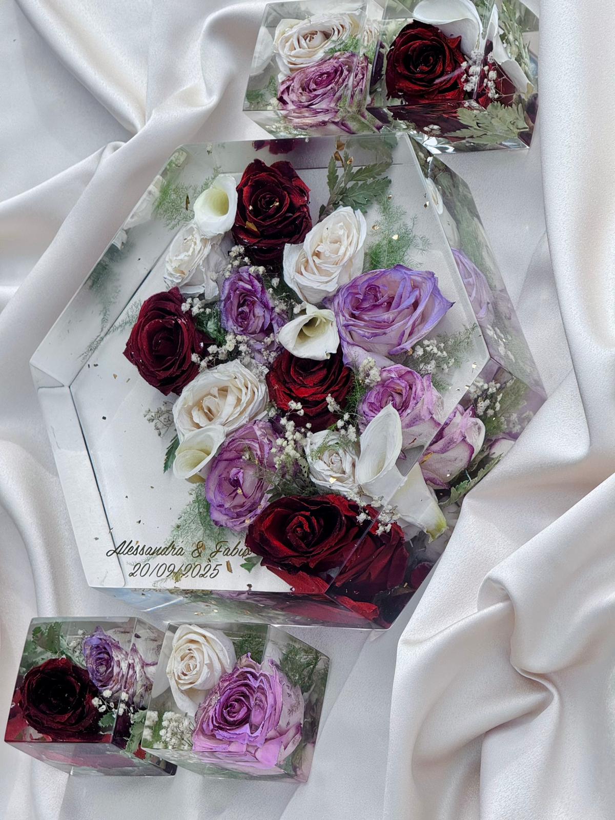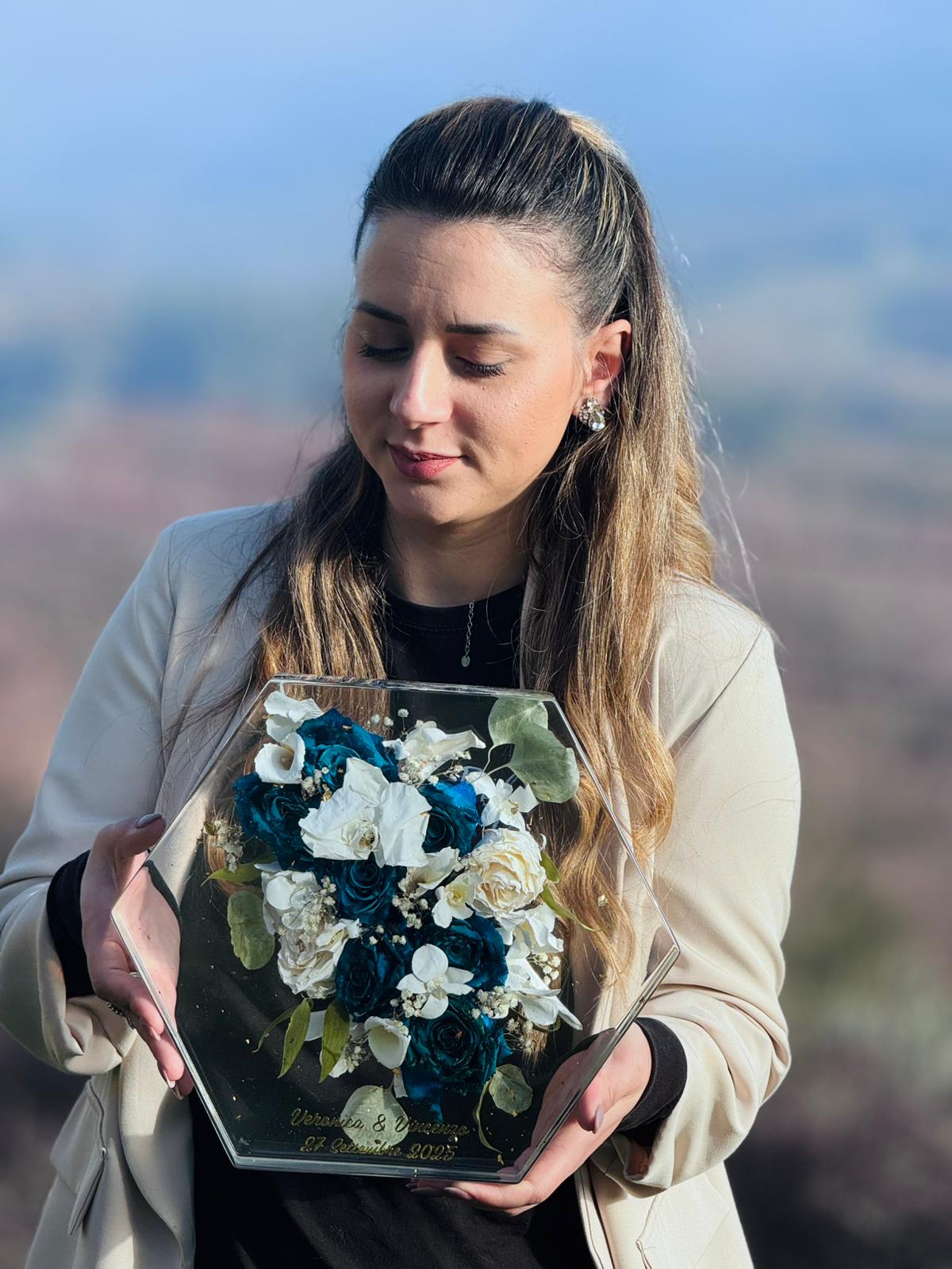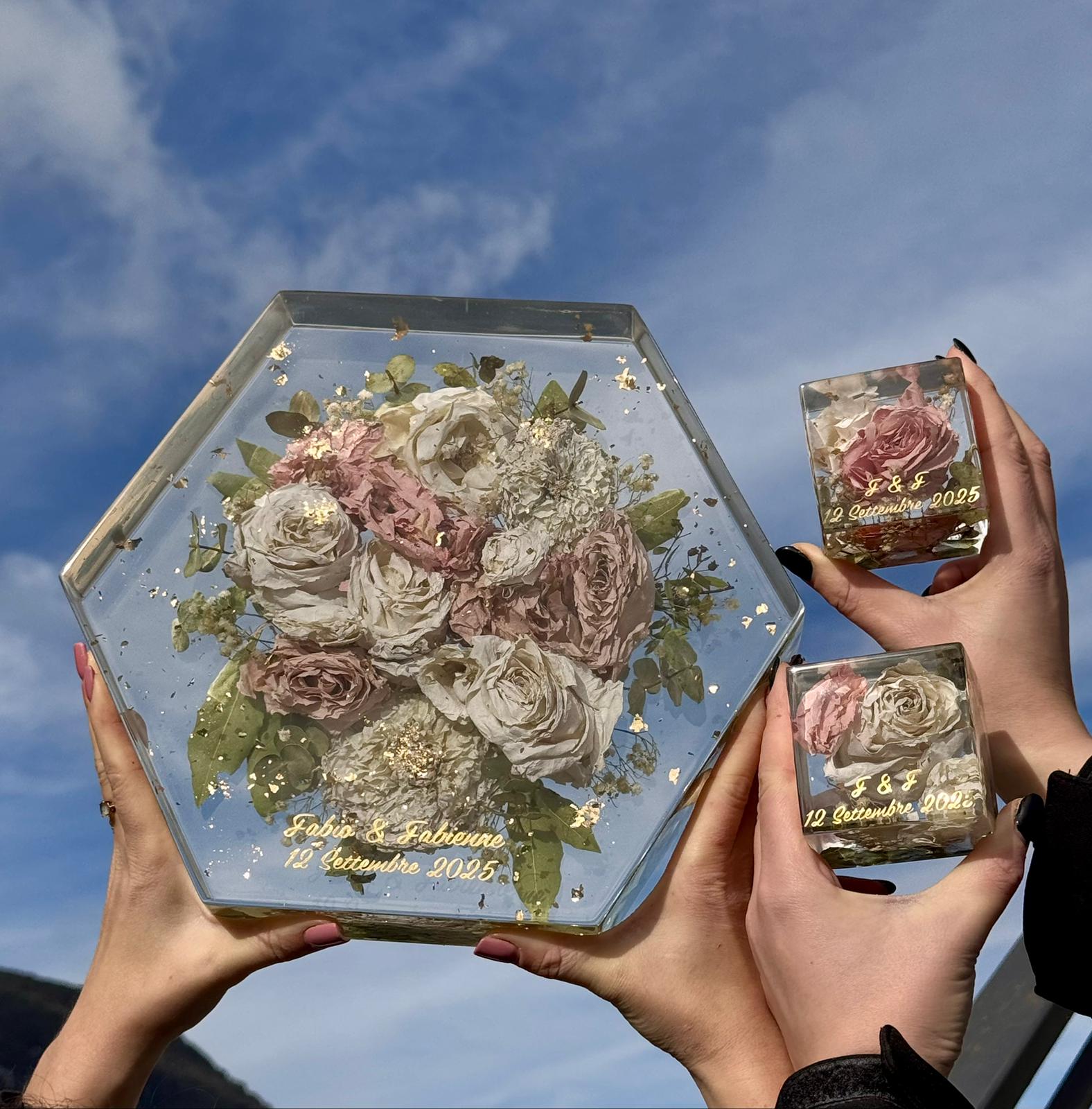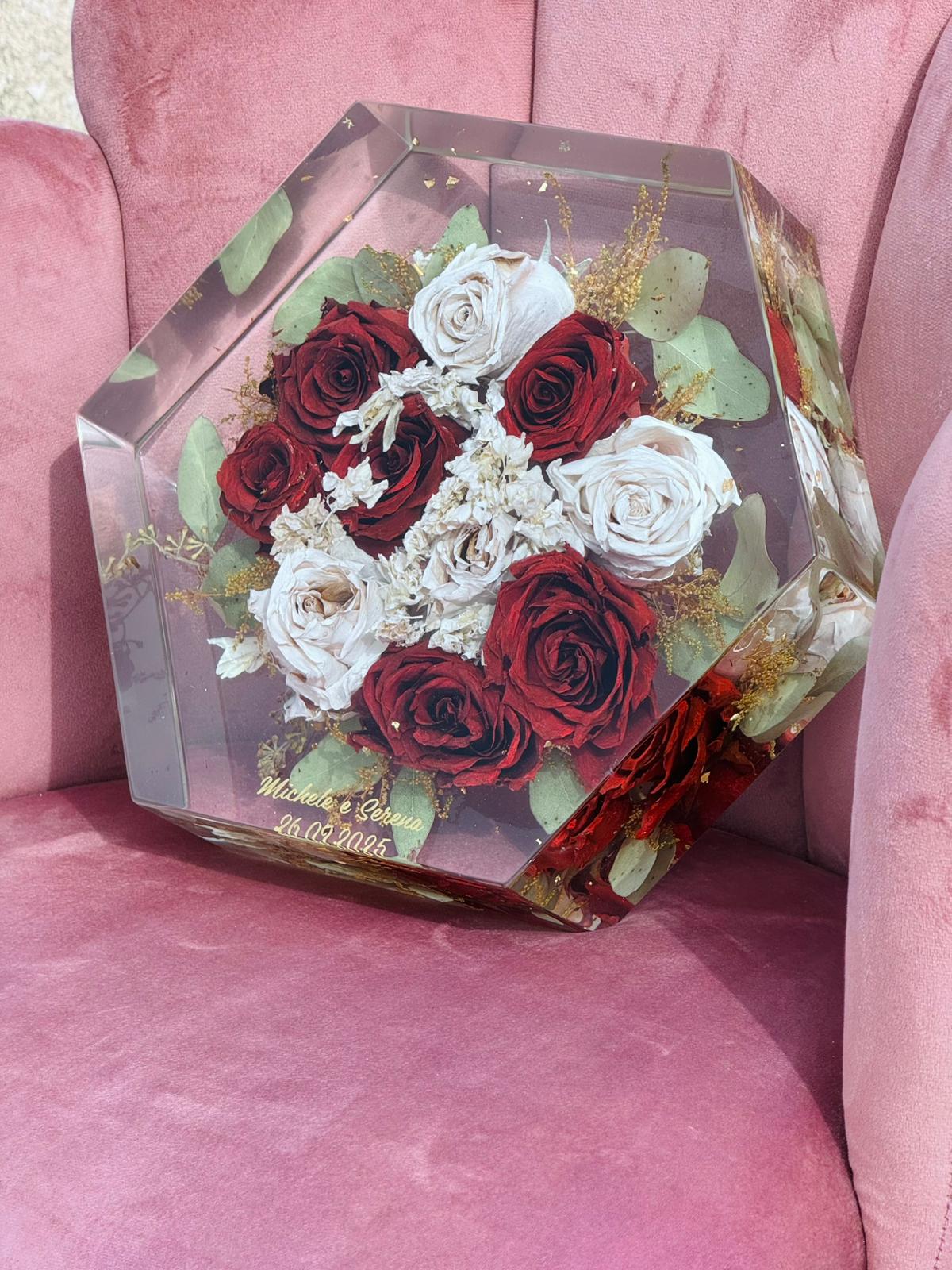 Acquistando questo articolo avrai la possibilità di preservare per sempre i fiori del tuo giorno più bello. Ci tengo a precisare che utilizzo una resina di alta qualità CICLOALIFATICA per evitare ingiallimento negli anni. Ci occupiamo noi del RITIRO dei fiori più SPEDIZIONE.E’ importante in caso di fiori freschi ricevere il bouquet il prima possibile dopo il matrimonio per un lavoro ottimale. Ti spiegherò io come imballare bene il pacco. Prenoterò poi il ritiro tramite il mio corriere che passerà direttamente a casa tua. Ricevuto il bouquet, avvio un processo di disidratazione, questa fase richiede tre settimane, dopo di che passo all’inglobazione dei fiori, un lavoro lungo e delicato. I miei sono formati EXTRA LARGE con misura 29x25cm. Il costo compreso di LUCIDATURA e VERNICIATURA per proteggere il tuo ricordo dai raggi UV. Il lavoro dura circa 3 MESI!