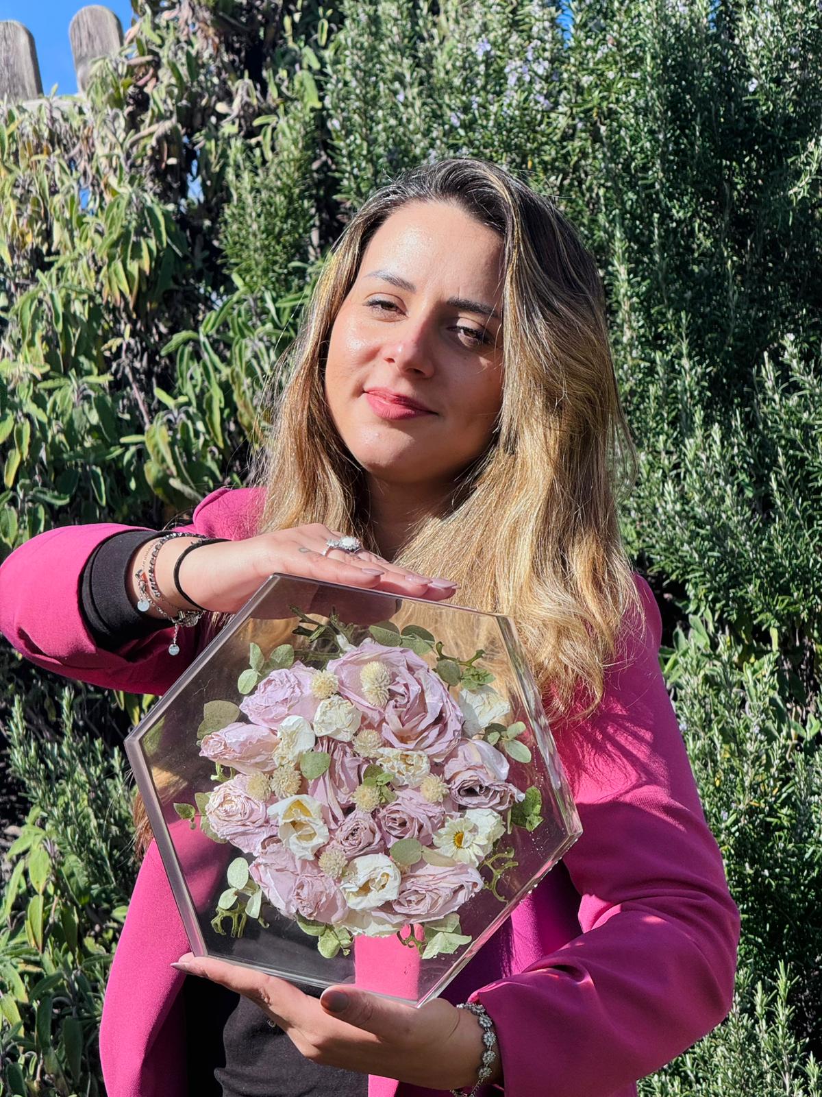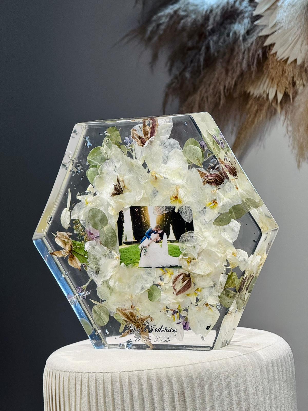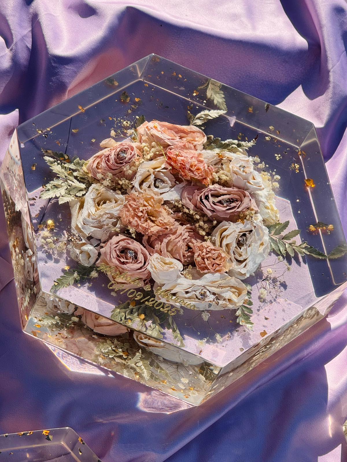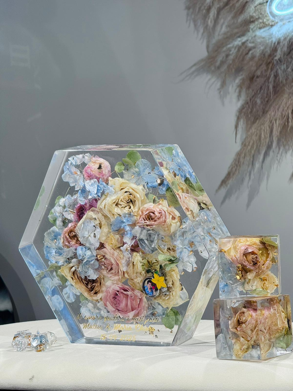 Acquistando questo articolo avrai la possibilità di preservare per sempre i fiori del tuo giorno più bello. Ci tengo a precisare che utilizzo una resina di alta qualità CICLOALIFATICA per evitare ingiallimento negli anni. Ci occupiamo noi del RITIRO dei fiori più SPEDIZIONE.E’ importante in caso di fiori freschi ricevere il bouquet il prima possibile dopo il matrimonio per un lavoro ottimale. Ti spiegherò io come imballare bene il pacco. Prenoterò poi il ritiro tramite il mio corriere che passerà direttamente a casa tua. Ricevuto il bouquet, avvio un processo di disidratazione, questa fase richiede tre settimane, dopo di che passo all’inglobazione dei fiori, un lavoro lungo e delicato. I miei sono formati EXTRA LARGE con misura 29x25cm. Il costo compreso di LUCIDATURA e VERNICIATURA per proteggere il tuo ricordo dai raggi UV. Il lavoro dura circa 3 MESI!