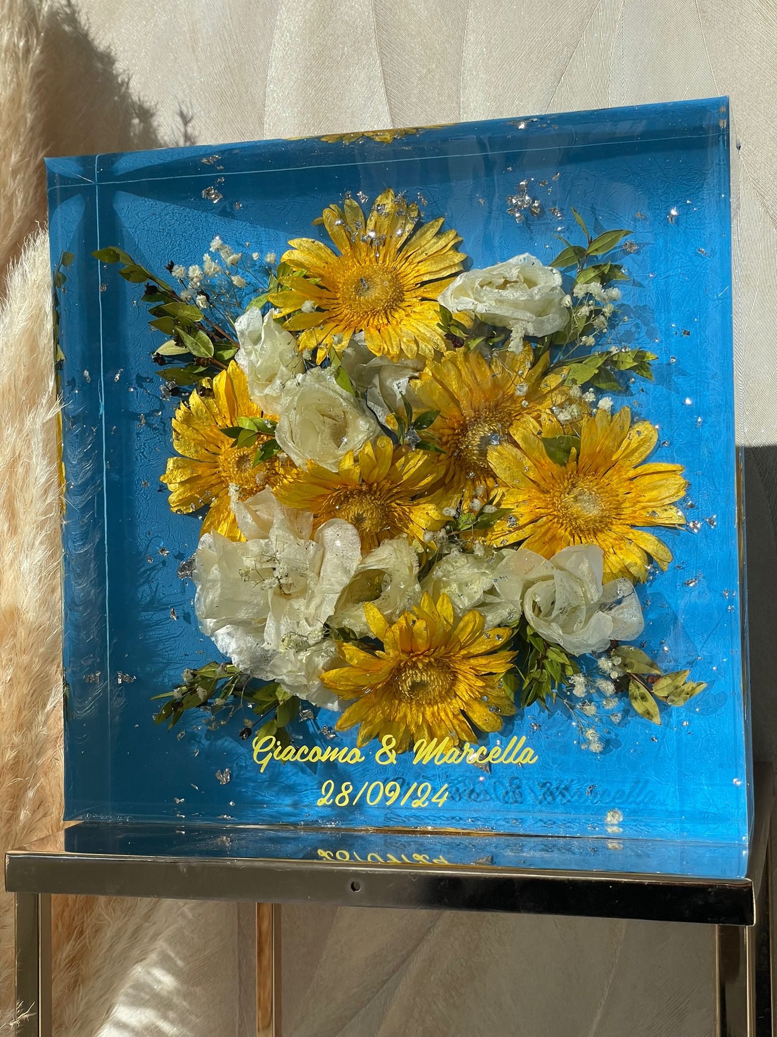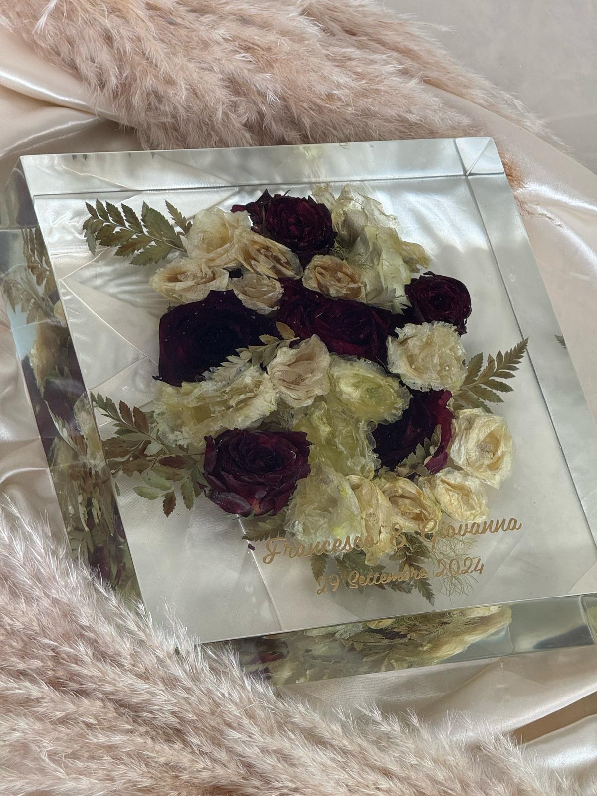 Acquistando questo articolo avrai la possibilità di preservare per sempre i fiori del tuo giorno più bello. Ci tengo a precisare che utilizzo una resina di alta qualità CICLOALIFATICA per evitare ingiallimento negli anni. Il prezzo è compreso di RITIRO dei fiori più SPEDIZIONE.E’ importante in caso di fiori freschi ricevere il bouquet il prima possibile dopo il matrimonio per un lavoro ottimale. Ti spiegherò io come imballare bene il pacco. Prenoterò poi il ritiro tramite il mio corriere che passerà direttamente a casa tua. Ricevuto il bouquet, avvio un processo di disidratazione, questa fase richiede due settimane, dopo di che passo all’inglobazione dei fiori, un lavoro lungo e delicato. I miei sono formati EXTRA LARGE a scelta quadrato o esagonale, entrambe con una misura di 25cm/30cm. Il costo compreso di LUCIDATURA. Il lavoro dura circa 3 MESI! 25X 25CM