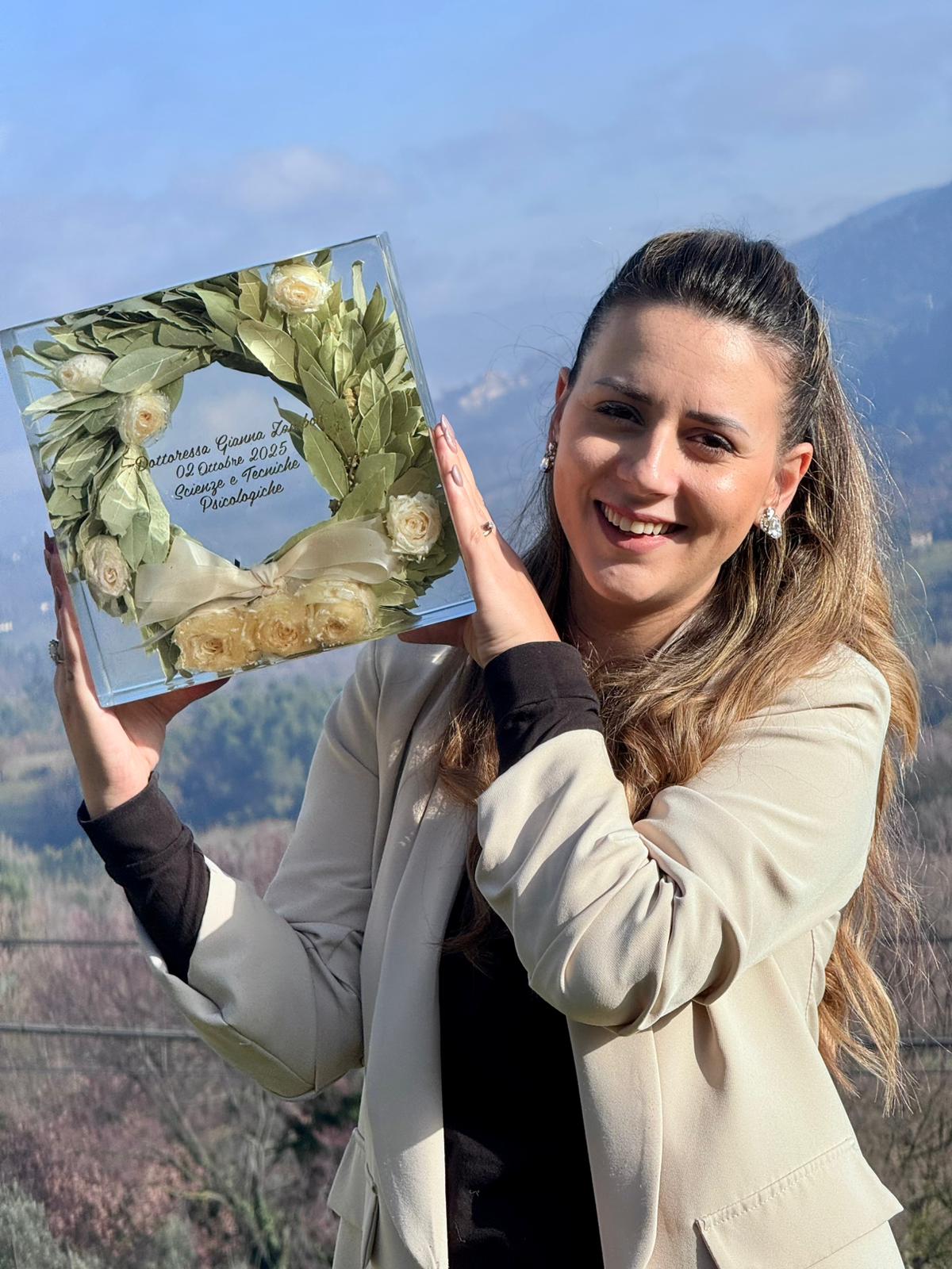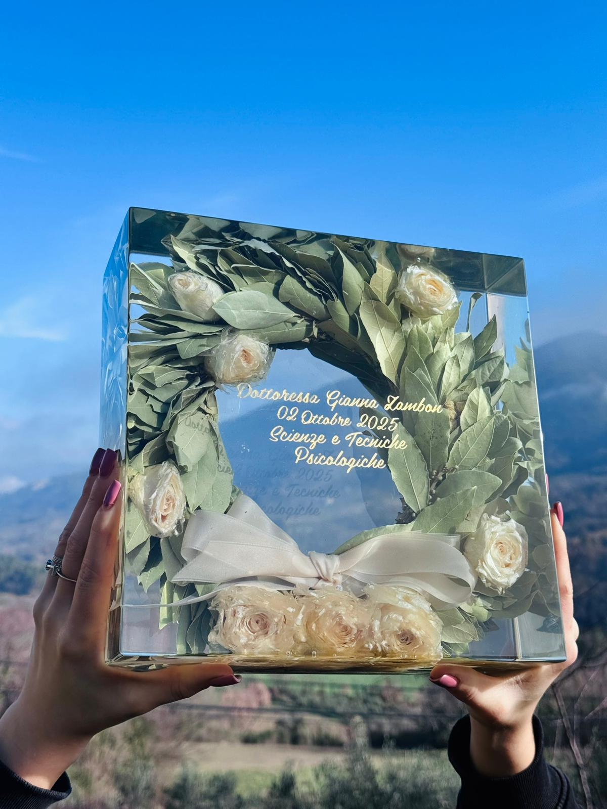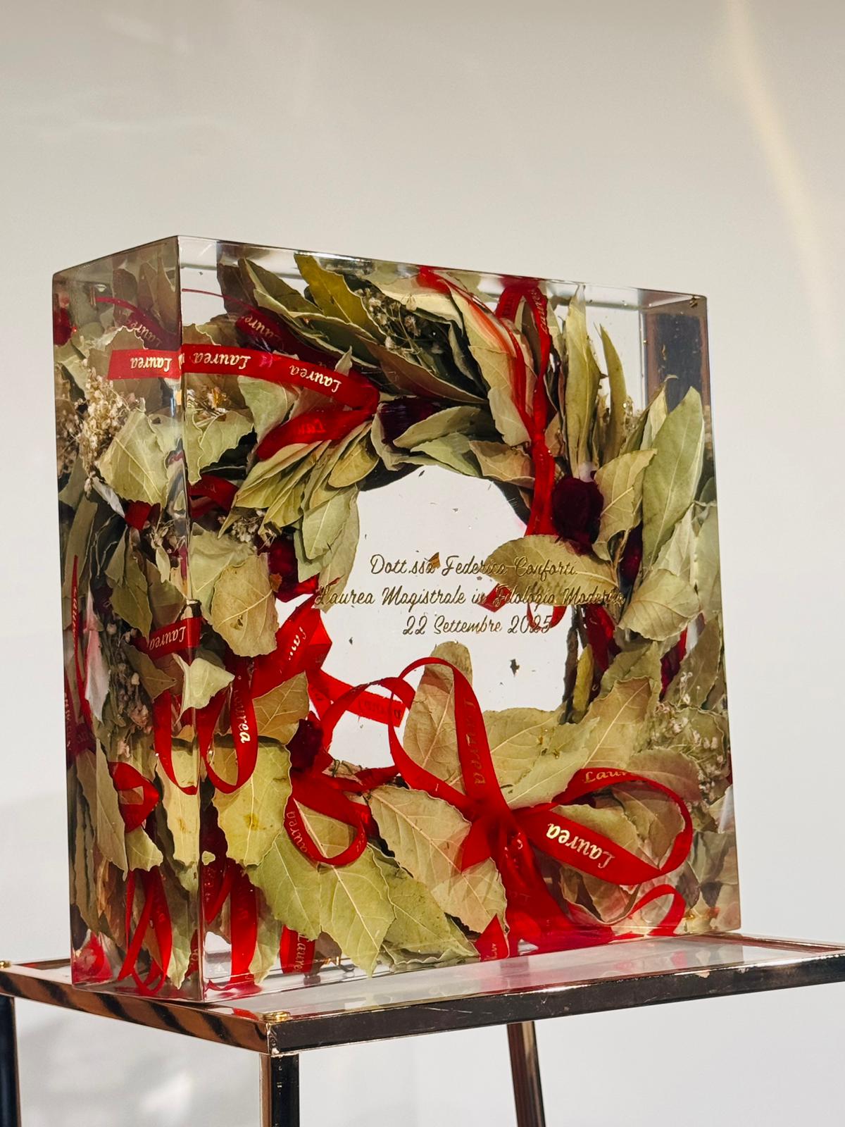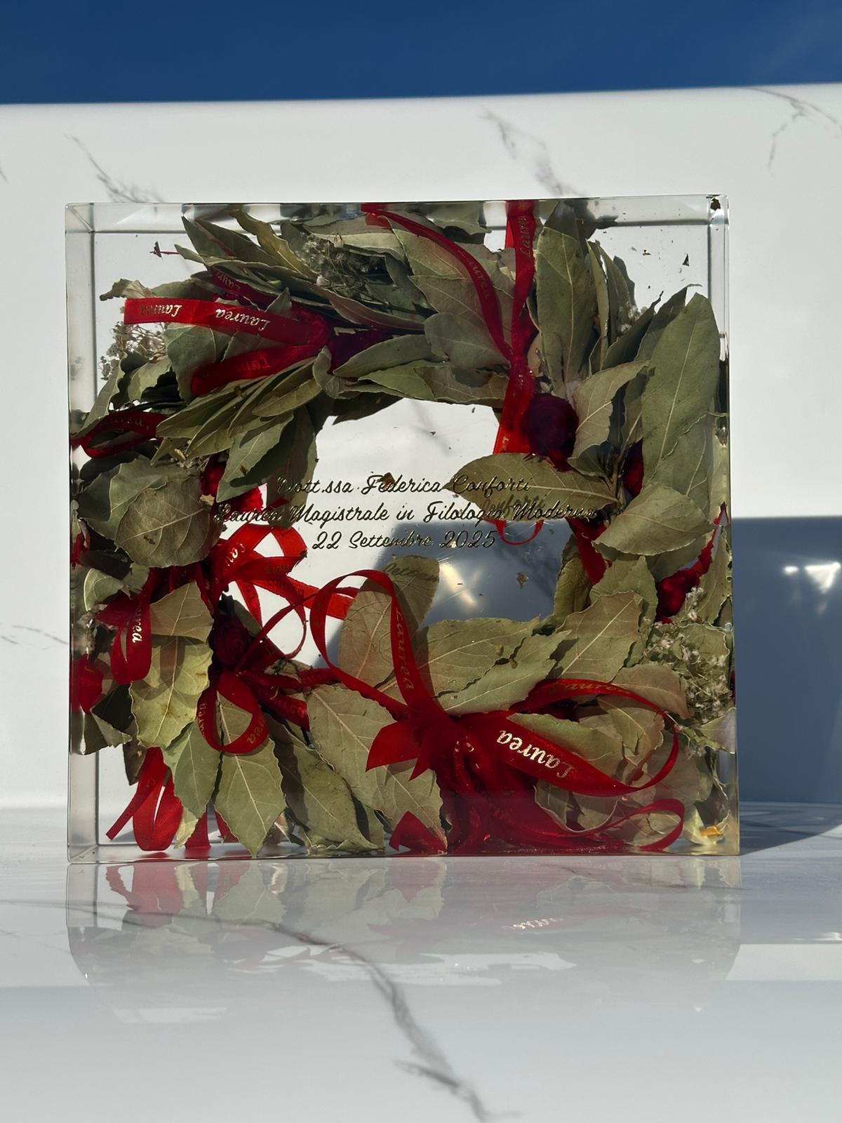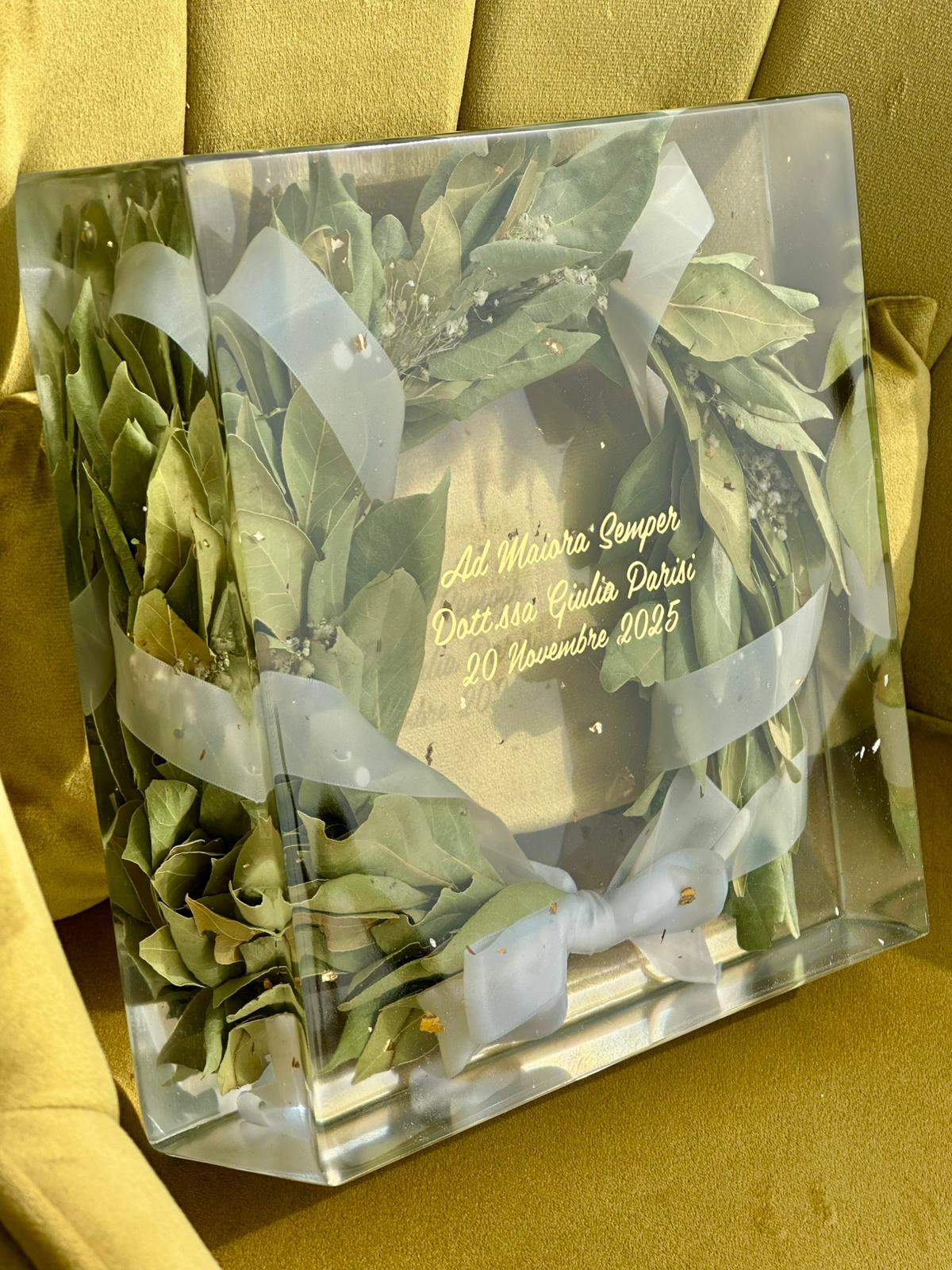 Porta con te per sempre il simbolo del tuo successo con la mia corona di laurea conservata in resina cicloalifatica di altissima qualità.Un lavoro artigianale lungo e meticoloso, che richiede ben due mesi di attenzione e cura per preservare il tuo ricordo più prezioso in eterno. Un pezzo unico e speciale, perfetto per celebrare il tuo traguardo con stile e eleganza. Un regalo indimenticabile per te stesso o per chi ami, che racconta la tua storia di successo in modo unico e originale. Blocco 27X30